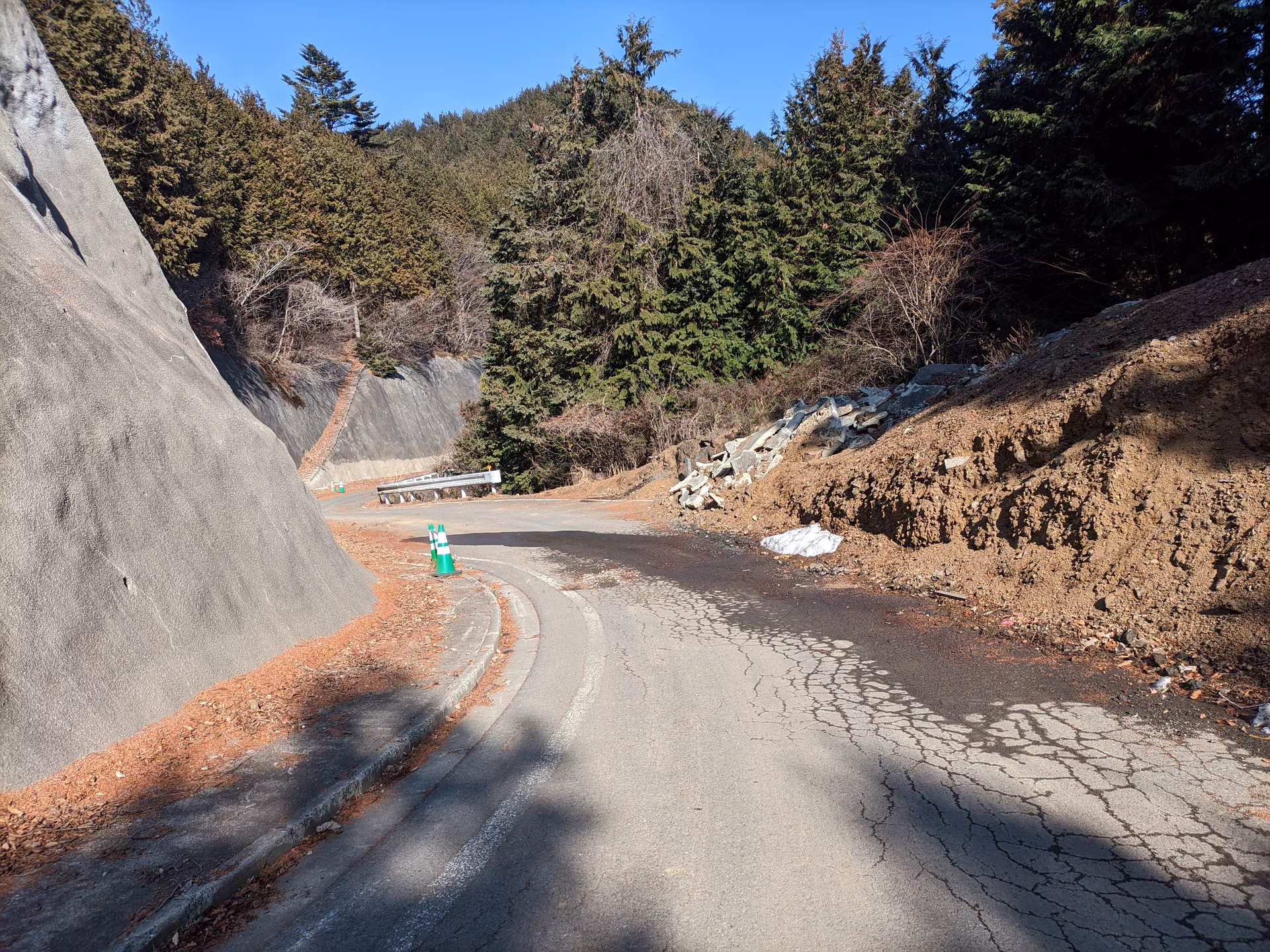 少し進んだ先に簡易バリケードがありました(画像略)。車は入れません。バイクは横から入れるかな?