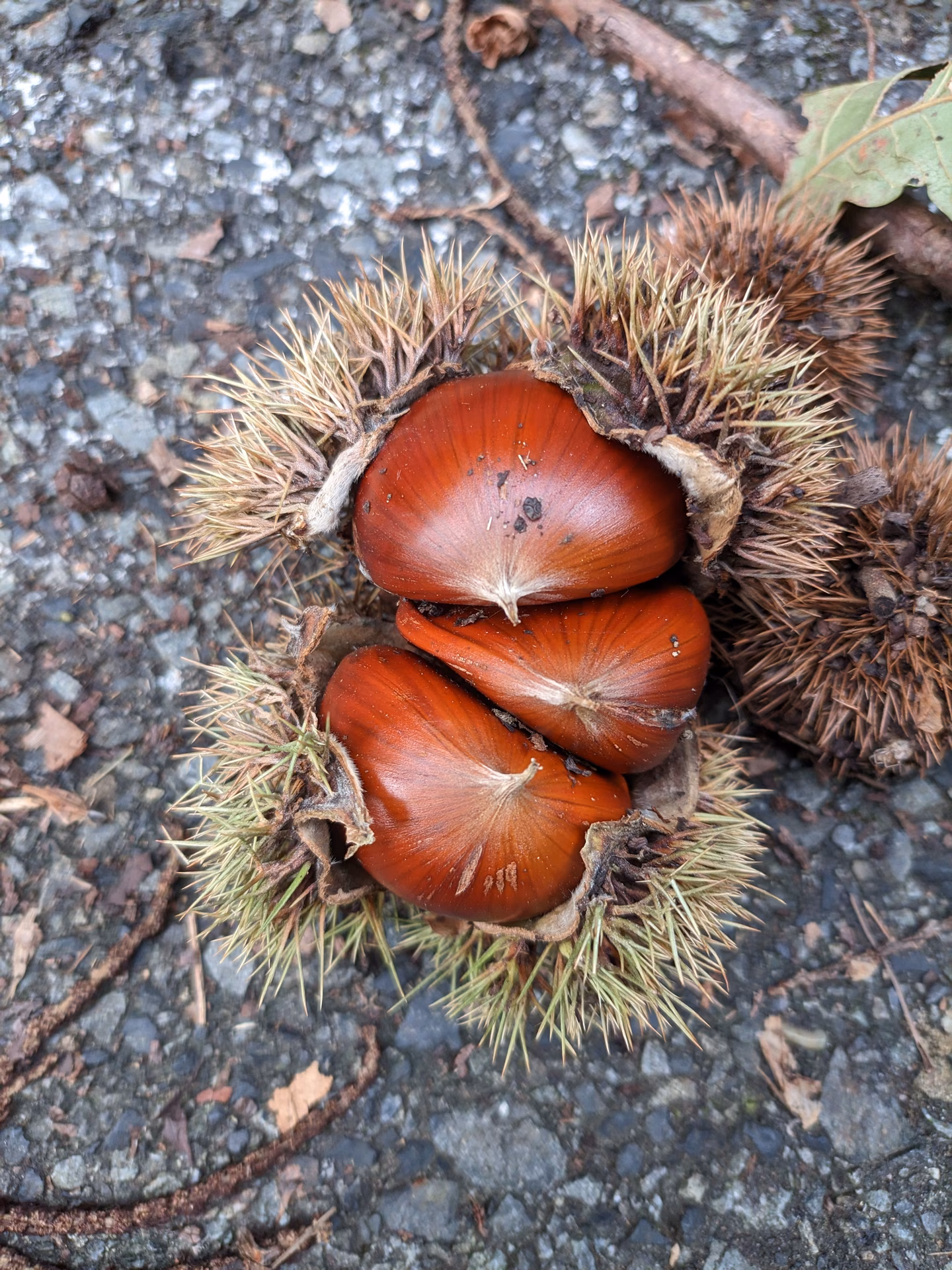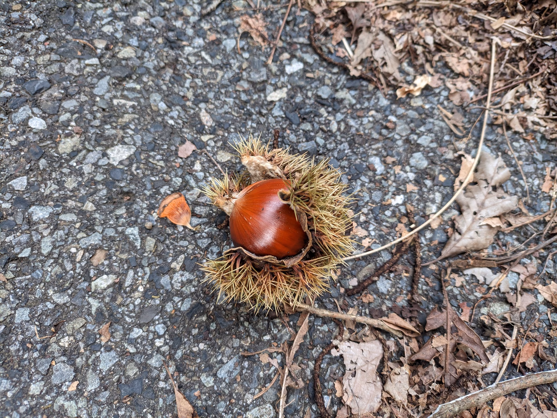 デカいし、舗装路上に落ちてるから状態もいい。そこら辺の道路だったら秒でジジババに回収されてそうな栗です。
